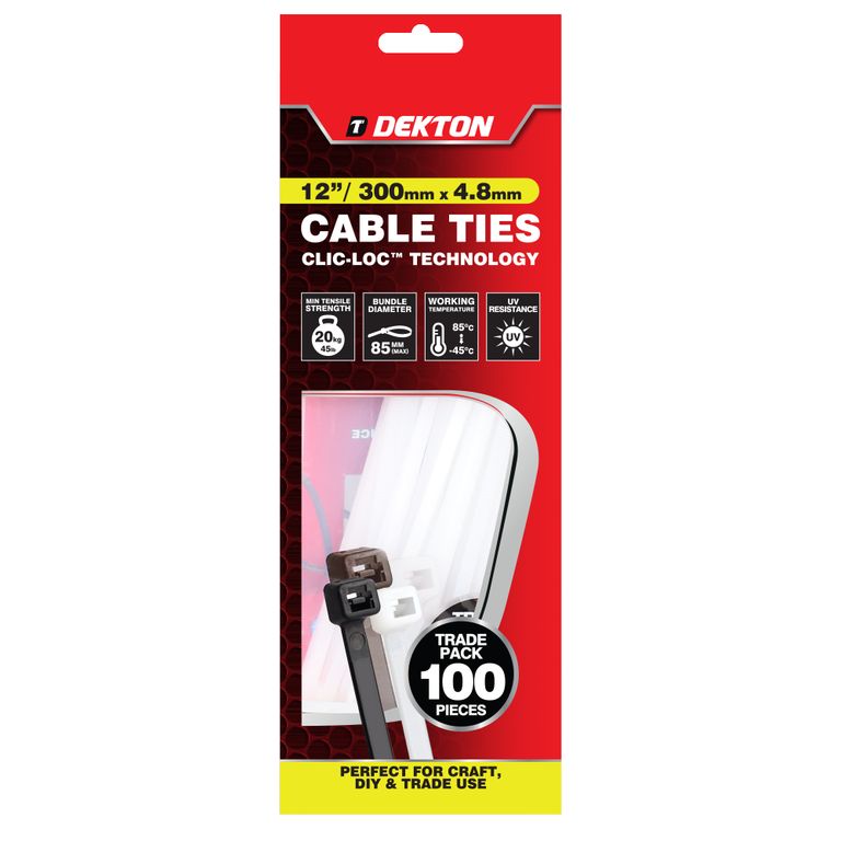 DEKTON 100 PCS 4.8MM X 300MM WHITE CABLE TIES
