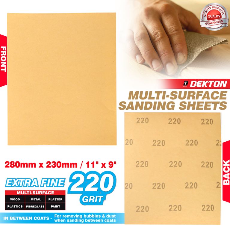 DEKTON 10PC MULTI-SURFACE SANDING SHEETS 280MMX230MM/ EXTRA FINE - 220 GRIT