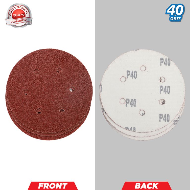 5 pieces. Suitable for orbital sanders. Diameter 150mm. DT80712: 40 grit DT80714: 60 grit DT80716: 80 grit DT80718: 120 grit Multi-surface: wood, metal, plaster, plastics, fibreglass, paint.