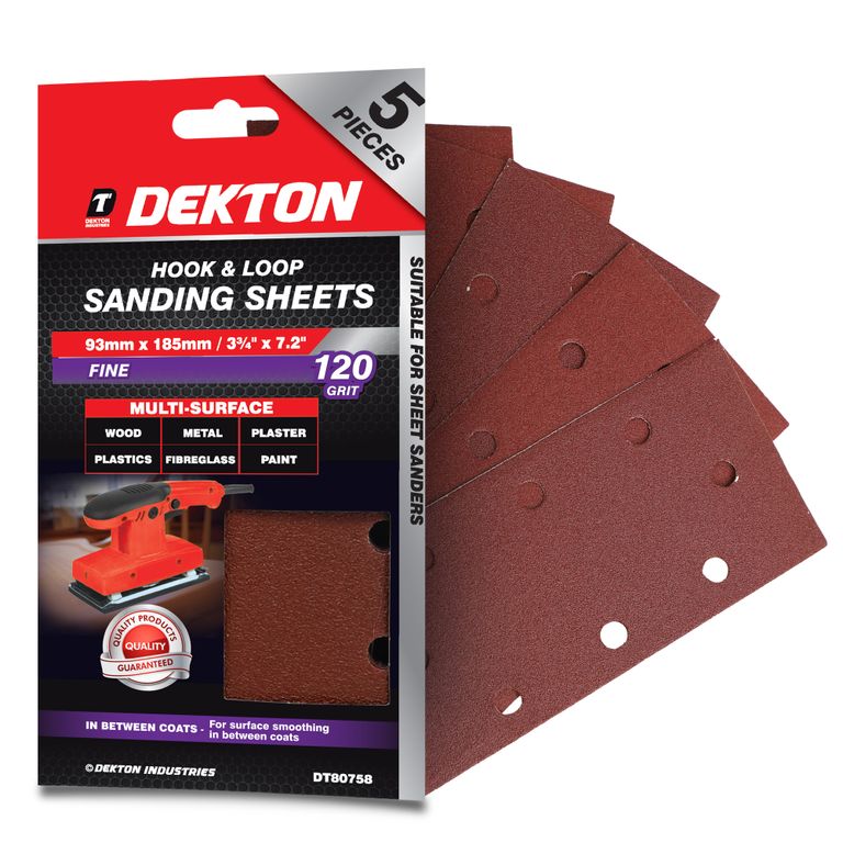 DEKTON 5PC HOOK AND LOOP SANDING SHEETS 93MMX185MM/ FINE - 120 GRIT