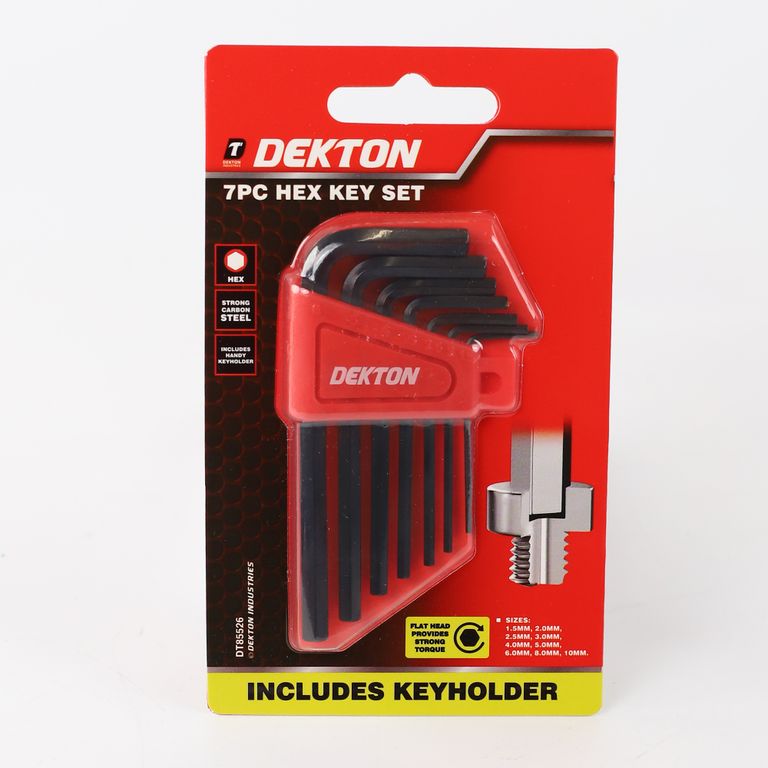 Includes sizes: 1.5mm, 2mm, 2.5mm, 3mm, 4mm, 5mm, 6mm, 8mm, 10mm. Strong carbon steel. Includes handy key holder.