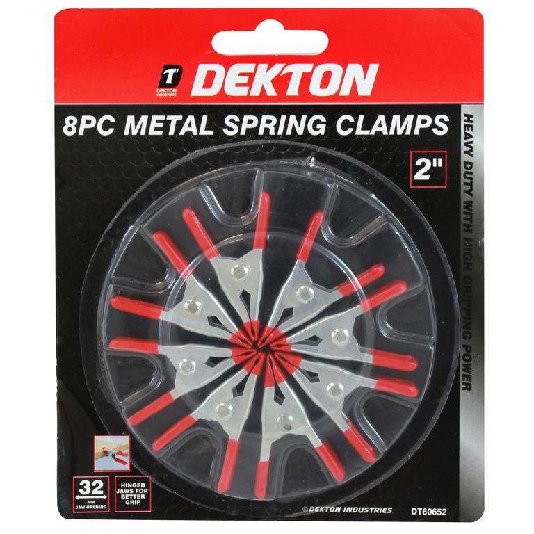 2â (60mm) Spring Clamps. 32mm jaw opening. Heavy duty with high gripping power. Ridged plastic for a non slip grip. Durable spring clamp made from tough plastic. Hinged jaws for a better grip on uneven surfaces.