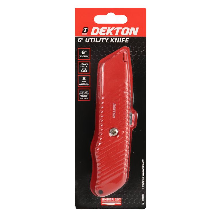 Heavy duty die cast 8 step smooth retraction. Ideal for cutting card, paper, leather, carpet and more.
